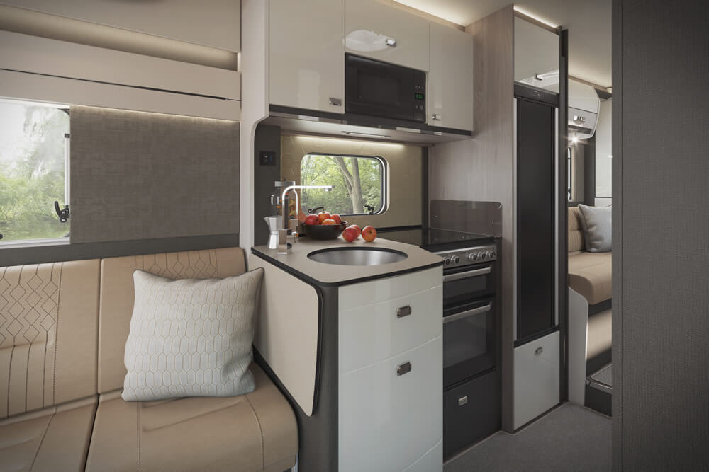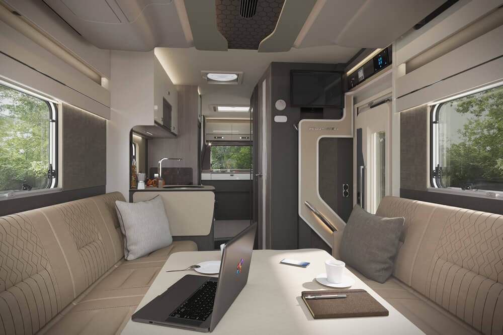 The flagship of the Swift range, our multi-award winning Kon-Tiki exudes glamour with its sleek lines, impeccable finishes and atmospheric lighting. The tactile Ultra-leather Cinnamon soft furnishing scheme creates a refined finish while the Aguti travelling seats offer practical yet stylish versatility.