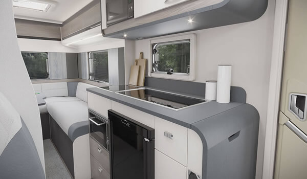 Most have a kitchen equipped with appliances for cooking including a hob, oven, microwave and fridge. Check out the compact food preparation space in the Monza below.